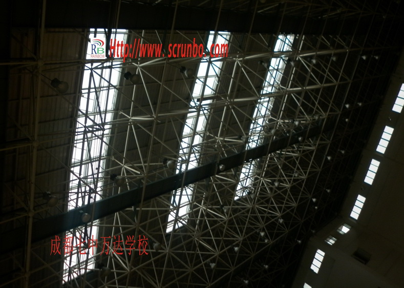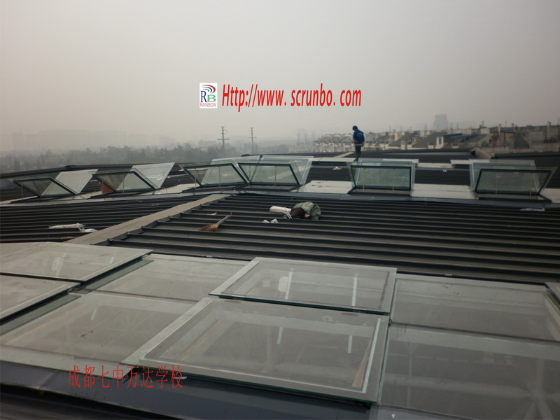 成都七中萬達學校位于成都市金牛區沙西線華僑城,由萬達集團捐資修建,建筑面積77588㎡,總投資近4億,體育館采光頂電動天窗115㎡,采用成都潤博RB雙齒條橋式開窗機構計36套72臺齒條式開窗機,通過機械傳動桿同步,中央消防控制箱KZ99-30A共計3套。手動日常通風及消防聯動控制。