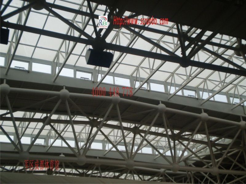 成都軍區體育館電動窗項目概述:體育館采用鋼網架結構,壓型鋁板屋面,通風氣樓結構;開啟扇采用大連實德塑鋼窗60平開型材,5mm鋼化單玻,共計120㎡;開窗機采用成都潤博RB單鏈式開窗機RB-LT300共計88臺,中央控制箱KZ99-40A共計4套,普通通風控制。